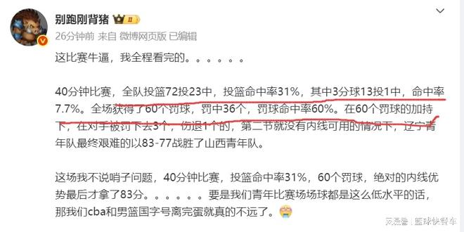 這絕對是中國籃壇最丑陋一戰(zhàn)。2025年U19全國男籃錦標(biāo)賽,遼寧隊(duì)迎戰(zhàn)山西隊(duì)。雙方經(jīng)過四節(jié)的較量,遼寧隊(duì)最終以83-77擊敗山西隊(duì),拒絕被對手上演大逆轉(zhuǎn),成功拿到小組賽首勝。不過,在這一場比賽,遼寧隊(duì)雖然涉險(xiǎn)過關(guān),成功拿下山西隊(duì)??扇珗霰荣?,遼寧隊(duì)的命中率卻非常糟糕,三分球更是13中1,命中率不足1成。而且,更為尷尬的是,此役遼寧隊(duì)獲得了足足60次罰球機(jī)會(huì),罰球數(shù)比山西隊(duì)足足多了43次。