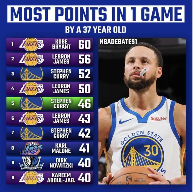 最近NBADEBATES1發(fā)布了37歲球員單場(chǎng)最高得分榜。科比、詹姆斯、庫(kù)里、馬龍、諾維茨基、賈巴爾等老將,都在37歲之后打出過(guò)40分以上的表現(xiàn),而且這些比賽全部是贏球。