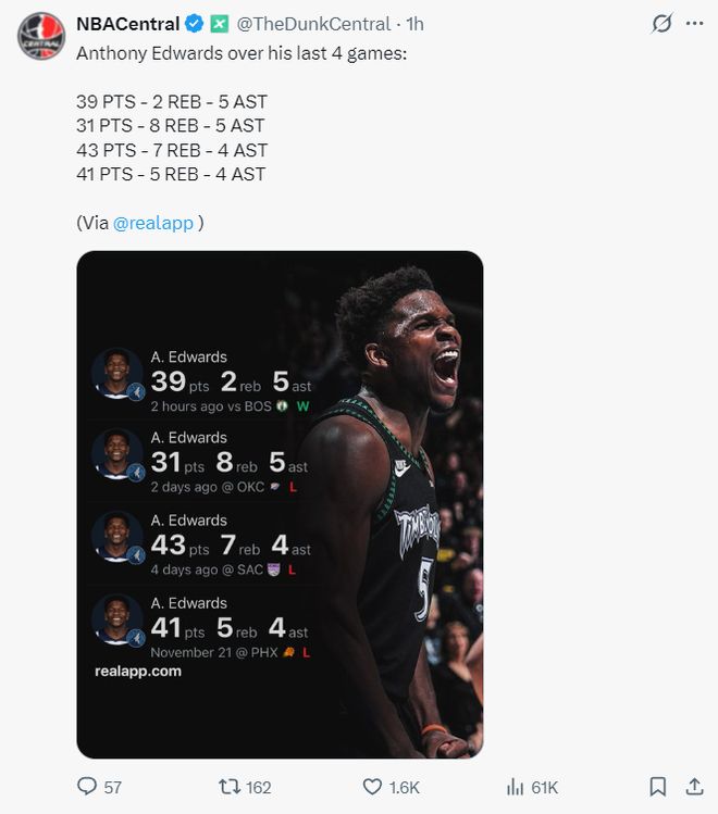 過去的四場比賽愛德華茲分別拿到39+5+2、31+8+5、43+7+4、41+5+4,但森林狼只拿到1場勝利,蘭德爾本賽季的狀態(tài)穩(wěn)定性極差,他都算不上球隊的第二巨頭了。