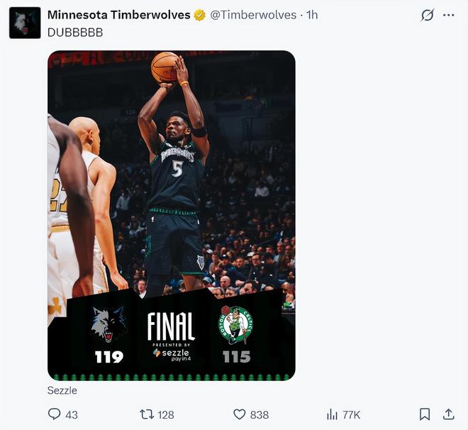 終場前14秒愛德華茲面對 懷特險些被搶斷,他從地上撿起球后直接后仰三分出手命中,這一球后森林狼領先到6分鎖定勝局,進入最后44秒愛德華茲兩個罰球+1個三分幫助球隊拿到勝利。