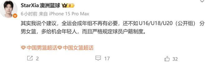 外界吐槽全運(yùn)會(huì)的雞肋,已經(jīng)不是一天兩天了,這些為了給高層領(lǐng)導(dǎo)增添功績(jī)的比賽,對(duì)于中國(guó)男籃的成長(zhǎng)確實(shí)不是一件好事。所以在輸給韓國(guó)賽后,媒體人Starxia澳洲籃球就建議,全運(yùn)會(huì)成年組沒有必要繼續(xù)存在了:“全運(yùn)會(huì)成年組不再有必要,還不如U16/U18/U20(公開組) 分男女籃,多給機(jī)會(huì)年輕人,而且嚴(yán)格規(guī)定球員戶籍制度?!?/p>