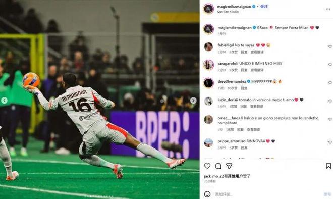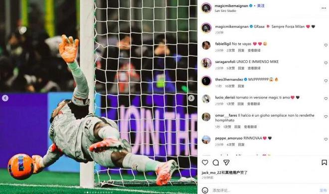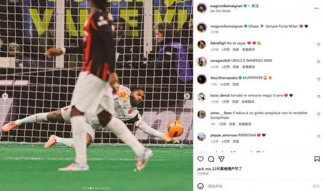 邁尼昂也在賽后通過(guò)社媒曬出自己的多張撲救照,并配文:“哈! 永遠(yuǎn)佛砸米蘭??”
