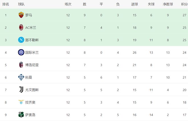 在積分榜上,羅馬排名榜首。羅馬的戰(zhàn)績是9勝3負(fù),拿到27分。AC米蘭和那不勒斯都是25分,排名第2和第3。第4的是國際米蘭,8勝4負(fù),拿到24分。博洛尼亞也是24分,排名第5??颇@場(chǎng)贏下之后,總積分達(dá)到21分,升到了第6名,超越了20個(gè)積分的尤文圖斯。拉齊奧只拿到18分,排名第8。亞特蘭大是本賽季強(qiáng)隊(duì)中下滑最嚴(yán)重的,只拿到13分,排名第13。