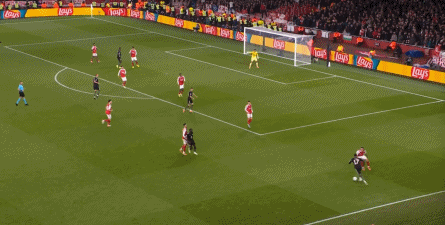 但在丟球之后,在阿森納的站位沒那么保守的時候,通過斜長傳還是可以打出機會,格納布里和小將卡爾一起傳跑,從而扳平了比分: