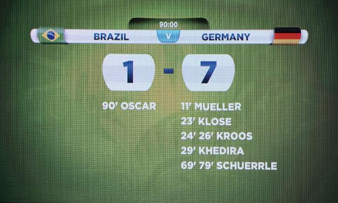 2014年7月8日,巴西世界杯半決賽上演驚世慘案,在貝洛奧里藏特,東道主巴西隊(duì)1-7遭到德國(guó)隊(duì)血洗,米內(nèi)羅體育場(chǎng)的比分牌成為了巴西球迷永遠(yuǎn)的痛。