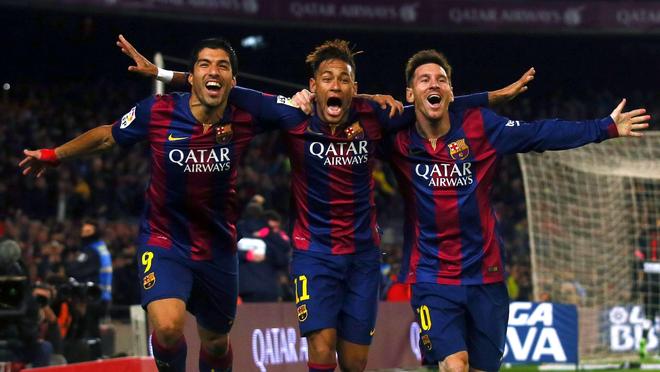 2015年1月11日,西甲第18輪,巴薩主場(chǎng)3-1擊敗馬競(jìng)。第87分鐘梅西破門鎖定勝局,進(jìn)球后梅西、蘇亞雷斯、內(nèi)馬爾三人肩并肩奔跑慶祝的畫面,成為MSN組合留給足壇最經(jīng)典的慶祝瞬間。