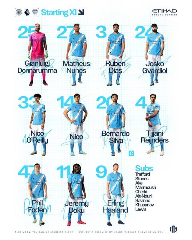 曼城首發(fā):25-多納魯馬、27-馬特烏斯-努內(nèi)斯、3-魯本-迪亞斯、24-格瓦迪奧爾、33-尼科-奧賴?yán)?4-尼科-岡薩雷斯、20-伯納多-席爾瓦、4-賴因德斯、47-福登、11-多庫、9-哈蘭德