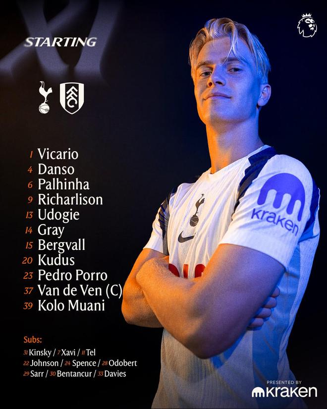 熱刺首發(fā):1-維卡里奧、23-波羅、4-丹索、37-范德芬、13-烏多基、6-帕利尼亞、14-阿奇-格雷、15-貝里瓦爾、20-庫杜斯、9-里沙利松、39-穆阿尼