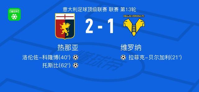 北京時間11月29日,意大利足球頂級聯(lián)賽第13輪,熱那亞坐鎮(zhèn)主場迎戰(zhàn)維羅納。比賽中,維羅納球員拉菲克-貝爾加利率先破門,為客隊取得領(lǐng)先。隨后熱那亞展開反擊,洛倫佐-科隆博在隊友維蒂尼亞的助攻下成功扳平比分。進(jìn)入下半場,熱那亞持續(xù)施壓,托斯比接埃勒特松傳球后攻入反超一球。最終全場比賽結(jié)束,熱那亞以2比1逆轉(zhuǎn)戰(zhàn)勝維羅納。